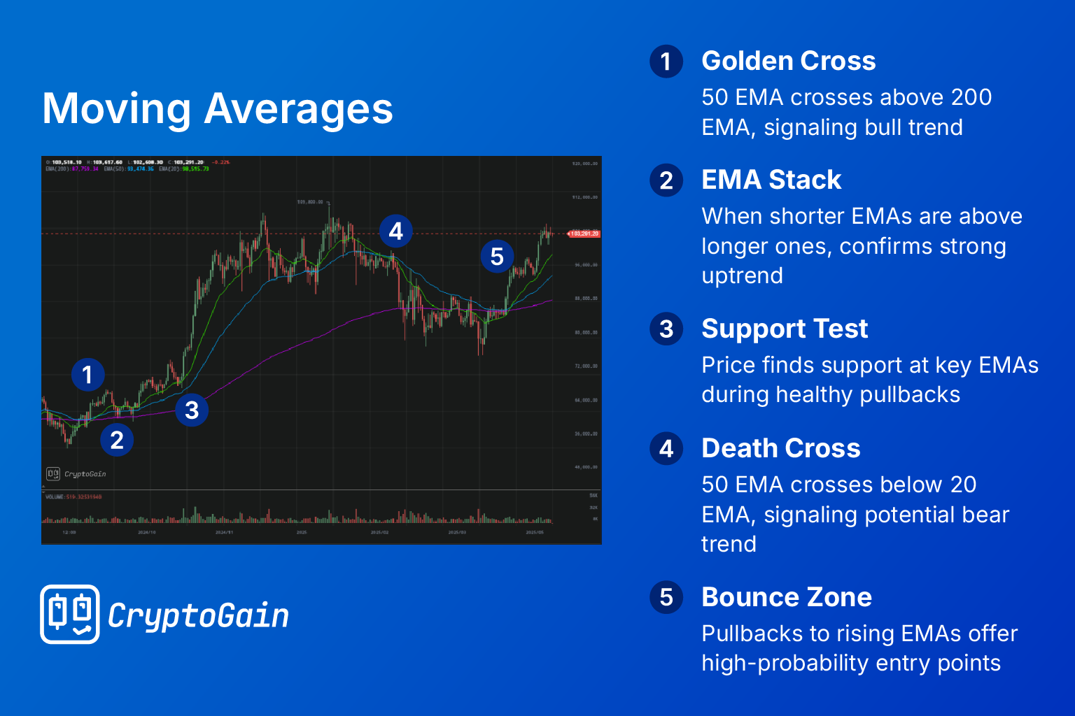 Moving average crossovers are powerful signals. When the 50-day crosses above the 200-day (the "golden cross"), it often signals the beginning of a bullish trend. Conversely, when the 50-day crosses below the 200-day (the "death cross"), it may indicate a bearish trend. The same scenarios can also be applied to the 20-day and 50-day moving averages.