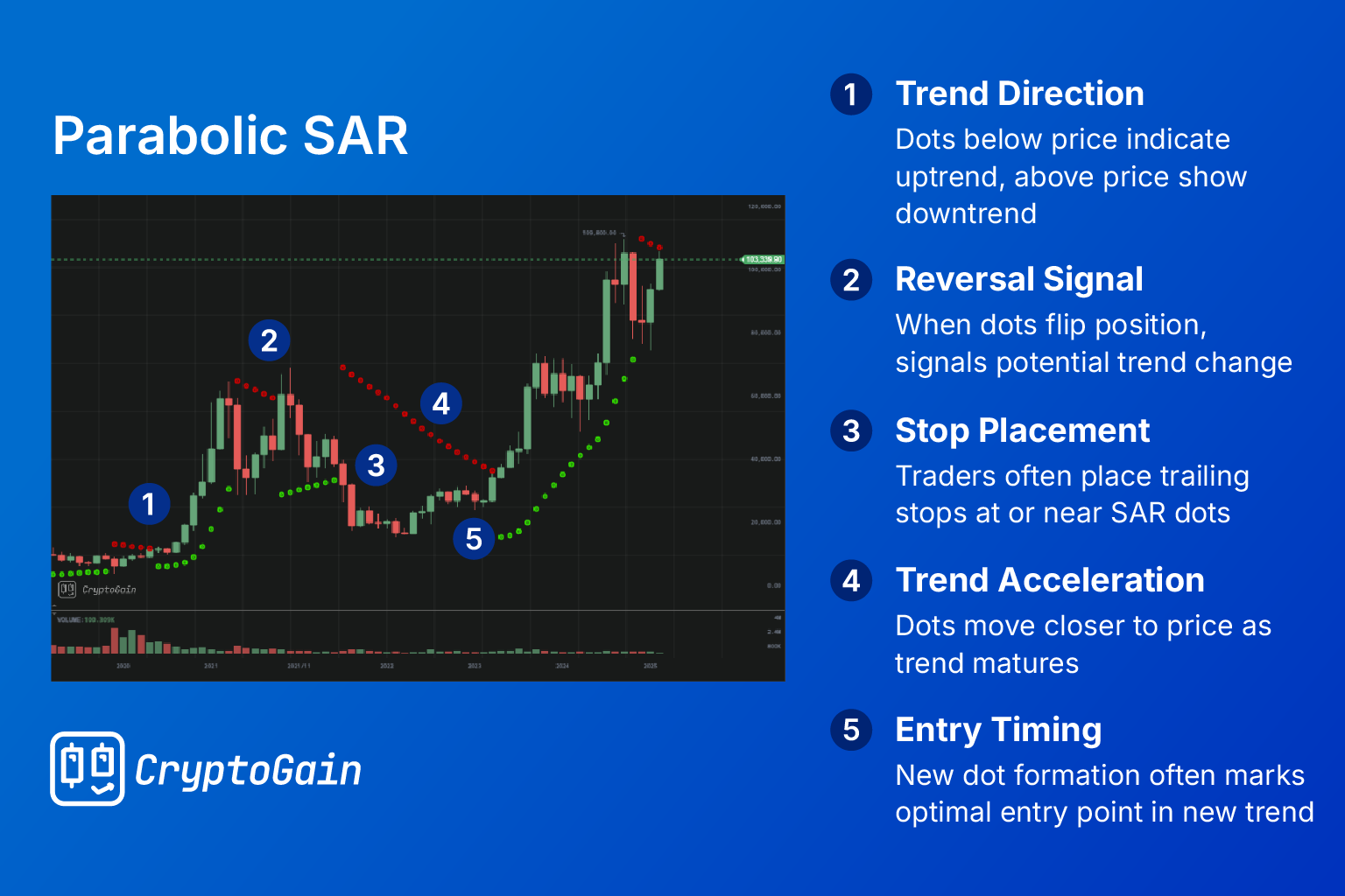 The Parabolic SAR (Stop and Reverse) indicator helps identify potential reversals in price momentum: