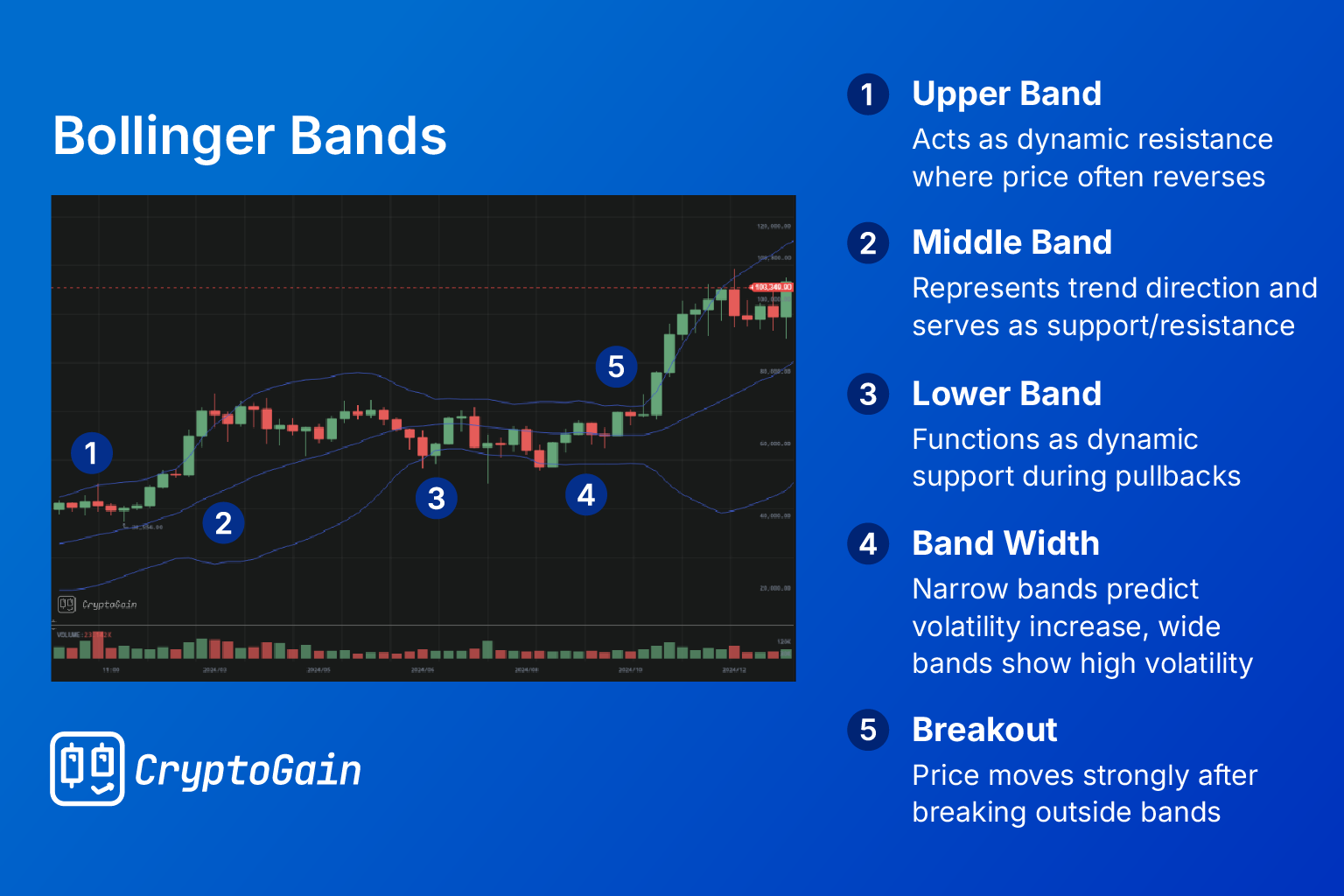 Bollinger Bands consist of a middle band (typically a 20-day SMA) with upper and lower bands set at 2 standard deviations: