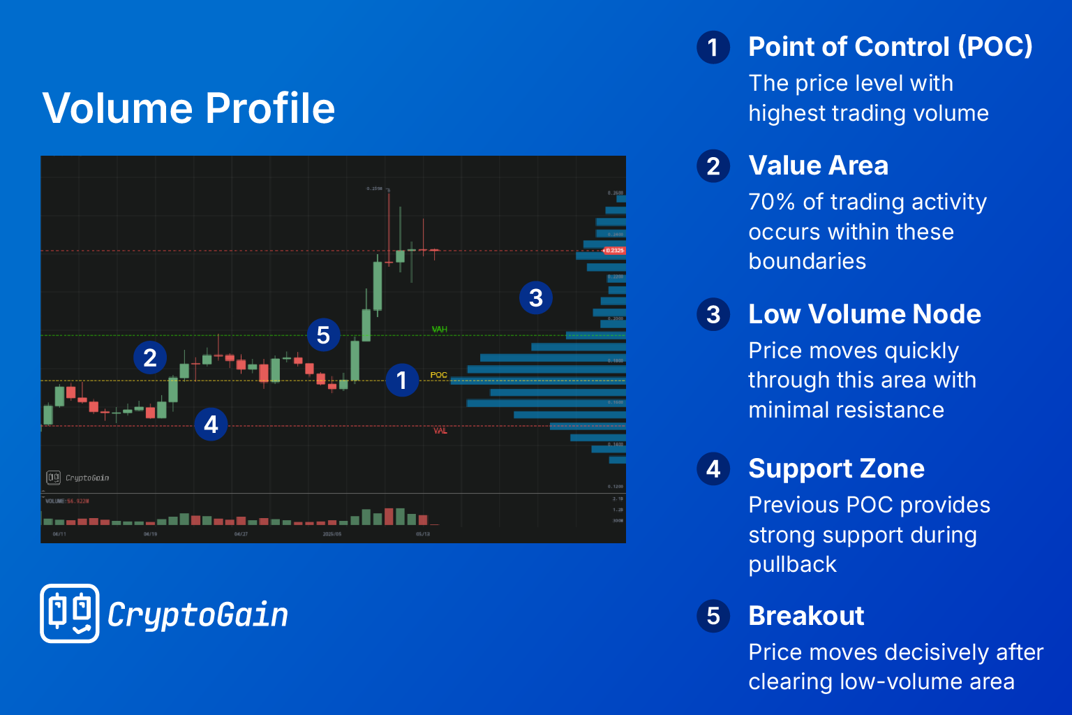 Volume Profile excels at identifying key support and resistance levels based on actual trading activity rather than just price movements. Areas of high volume often act as support/resistance, while low-volume areas typically allow for faster price movement when broken.